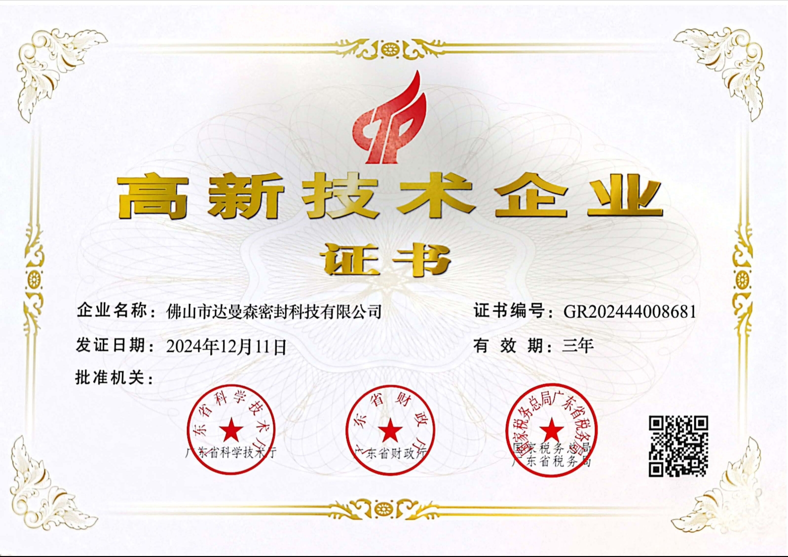 近日,佛山市達(dá)曼森密封科技有限公司再次榮獲由廣東省科學(xué)技術(shù)廳、廣東省財(cái)政廳、國(guó)家稅務(wù)總局廣東省稅務(wù)局聯(lián)合頒發(fā)的2024年國(guó)家級(jí)高新技術(shù)企業(yè)證書(shū)。達(dá)曼森密封于2018年首次通過(guò)國(guó)家高新企業(yè)認(rèn)證,這一次是第三次獲得該項(xiàng)殊榮。